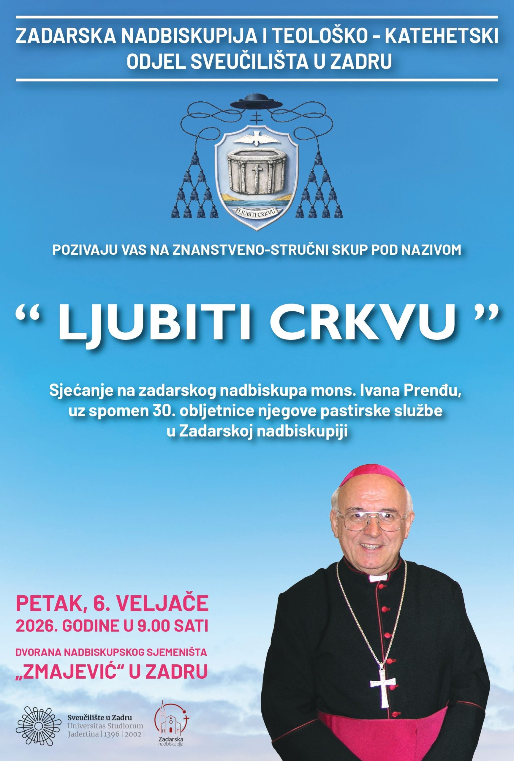 Zadarska nadbiskupija i Teološko-katehetski odjel Sveučilišta u Zadru organiziraju znanstveno-stručni skup pod naslovom „Ljubiti Crkvu“ – Sjećanje na zadarskog nadbiskupa mons. Ivana Prenđu, povodom 30. obljetnice njegove pastirske službe u Zadarskoj nadbiskupiji.