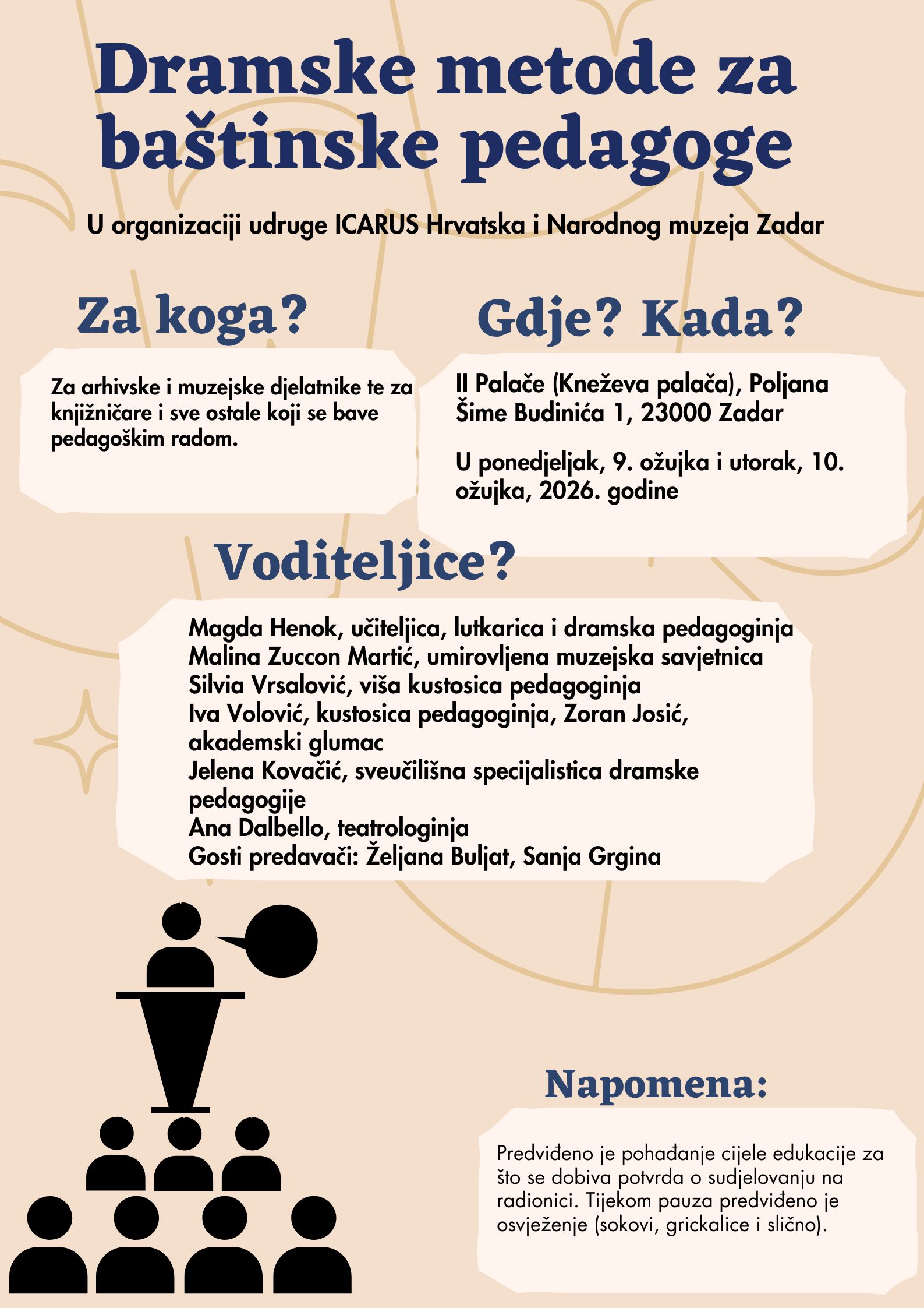 Narodni muzej Zadar u suradnji s udrugom ICARUS Hrvatska organizira stručni skup „Dramske metode za baštinske pedagoge“ koji će se održati u prostoru Kneževe palače u ponedjeljak, 9. i u utorak, 10. ožujka 2026. godine. Na stručnom skupu će svoja predavanja i radionice održati 9 izlagača koji će svoja stručna iskustva prenijeti sudionicima.