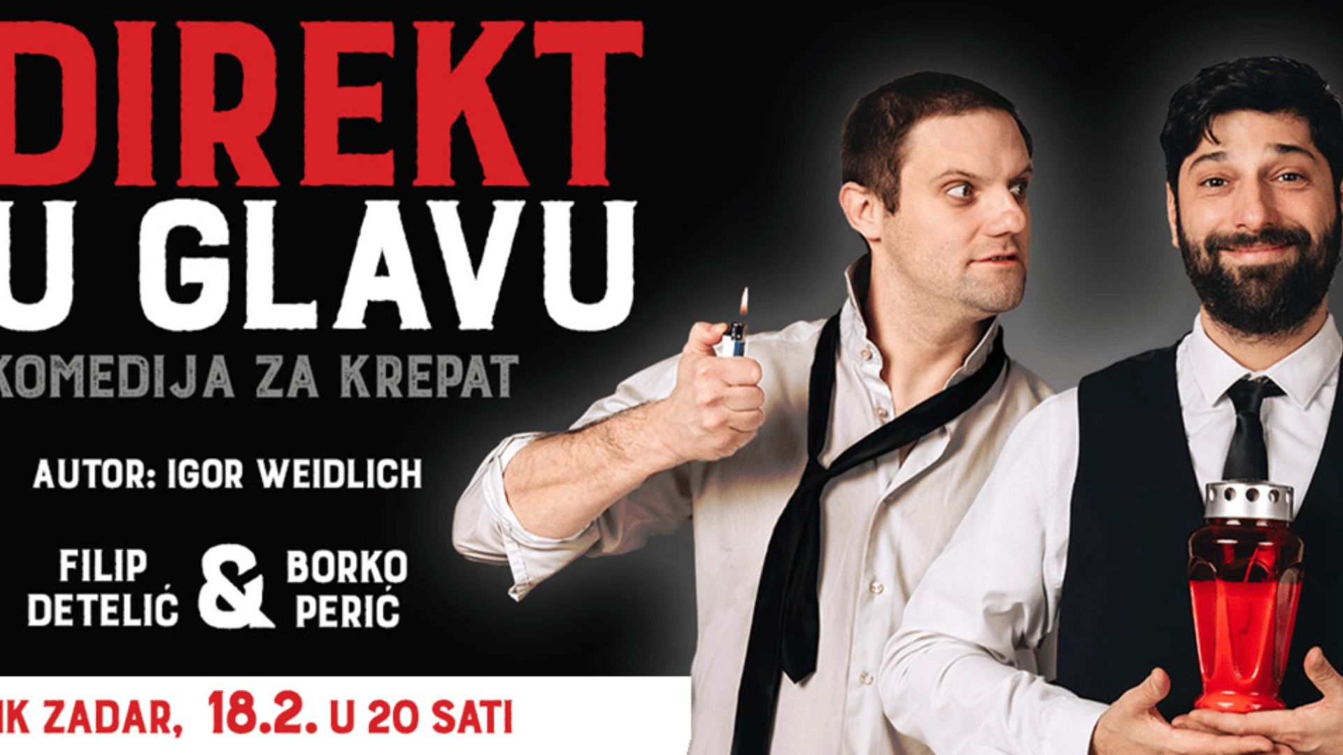 Na pozornici Hrvatskog narodnog kazališta Zadar u utorak, 18. veljače, s početkom u 20 sati, zadarska publika imat će priliku pogledati nesvakidašnju komediju. Riječ je o popularnoj komediji „Direkt u glavu” u kojoj glavne uloge tumače Borko Perić i Filip Detelić, dvojica istaknutih hrvatskih glumaca zagrebačkog kazališta Kerempuh i dobitnika Nagrade hrvatskog glumišta. Koliko ih publika voli u njihovim mnogobrojnim ulogama, pa čak i voditeljskim, dokazuje i tek osvojeni Zlatni studio za Najbolje TV lice kojeg je Filip Fetelić ovih dana osvojio.