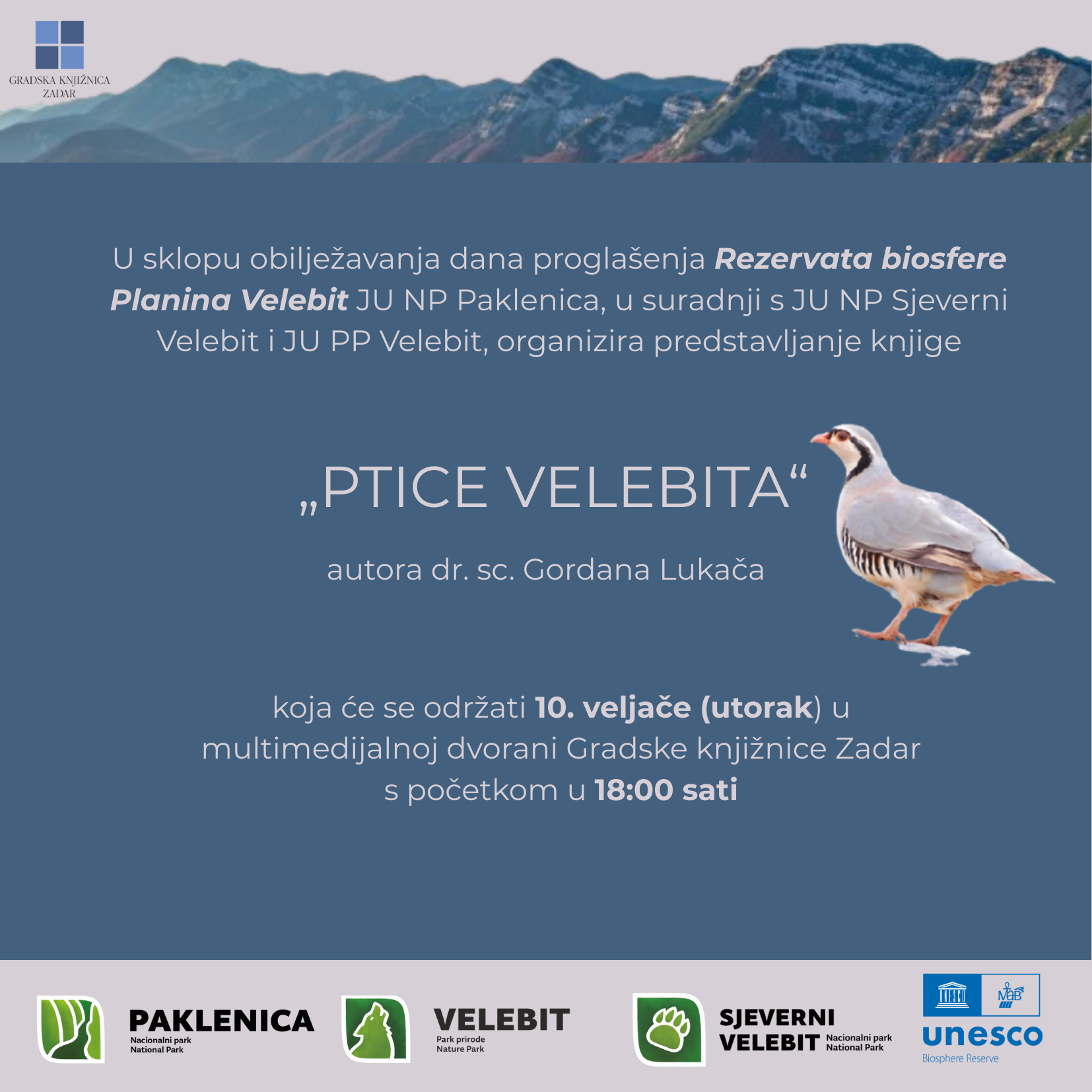 Javna ustanov “Nacionalni park Paklenica” najavljuje obilježavanje dana proglašenja Rezervata biosfere Planina Velebit u suradnji s JU NP Sjeverni Velebit i JU PP Velebit, u sklopu programa biti će i predstavljanje knjige  „PTICE VELEBITA“  autora dr. sc. Gordana Lukača.