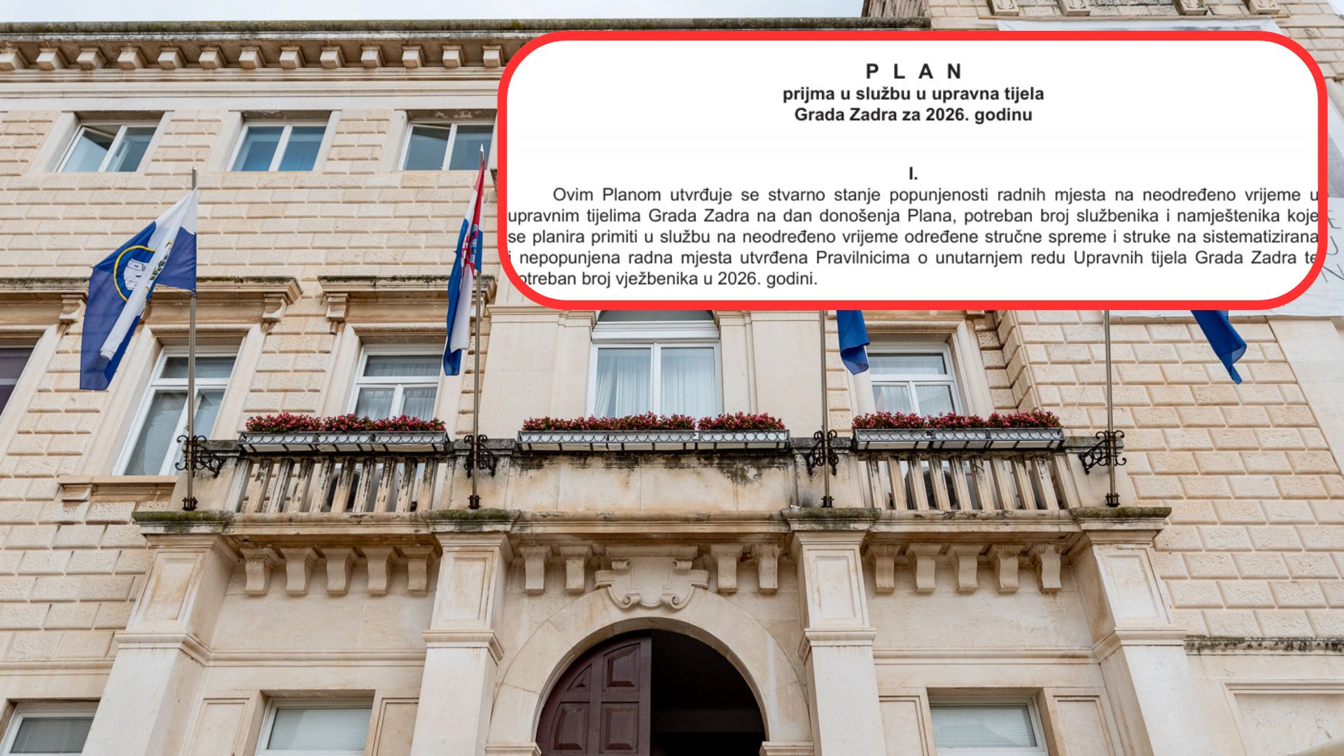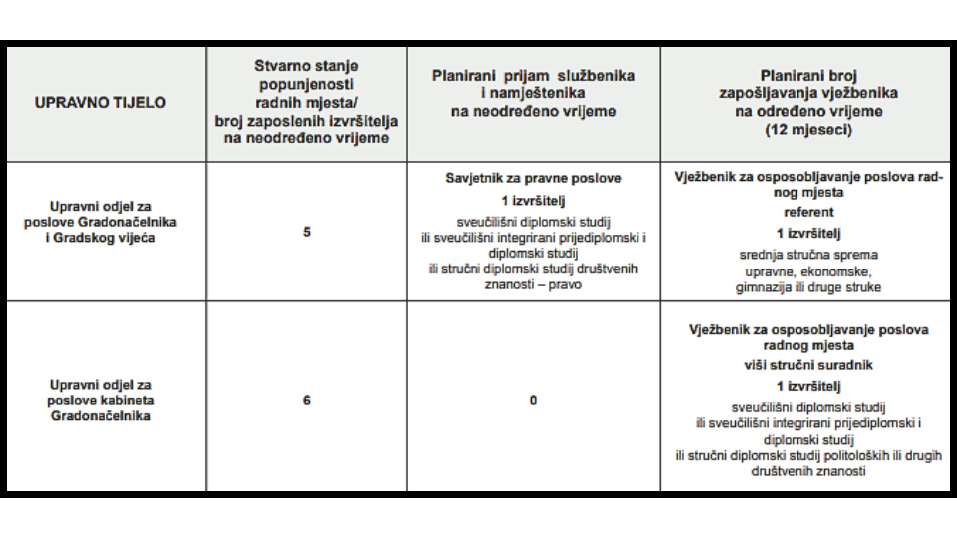 Napominju kako se ovime utvrđuje i potreban broj službenika i namještenika “koje se planira primiti u službu na neodređeno vrijeme određene stručne spreme i struke na sistematizirana i nepopunjena radna mjesta utvrđena Pravilnicima o unutarnjem redu Upravnih tijela Grada Zadra te potreban broj vježbenika u 2026. godini”.