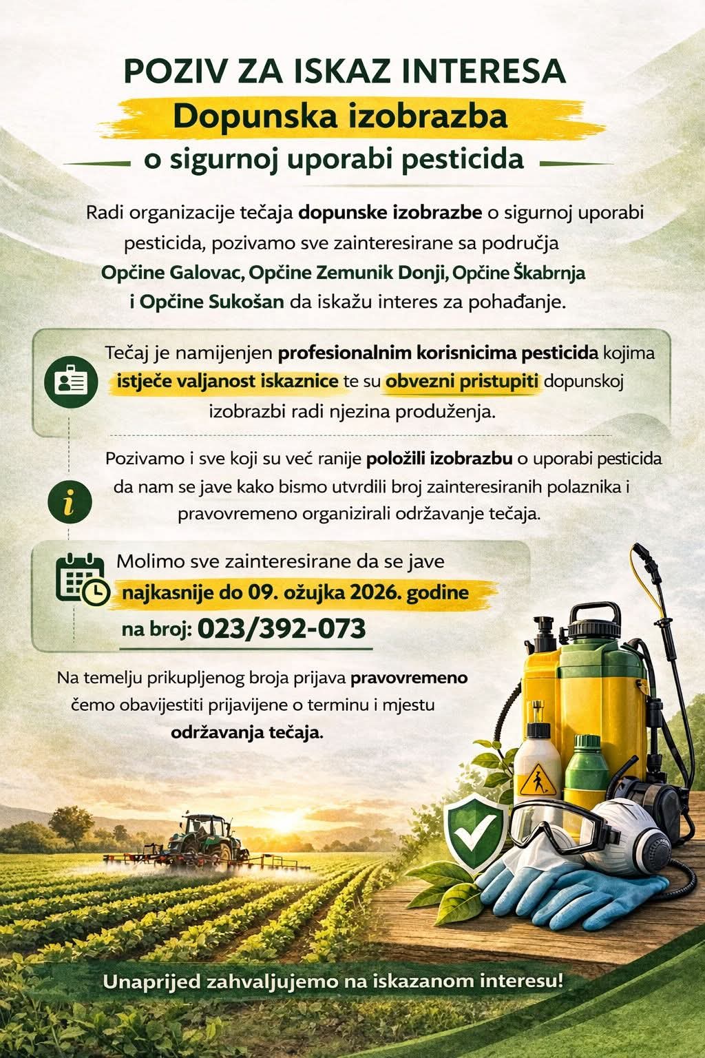 DOPUNSKA IZOBRAZBA Sigurna uporaba pesticida Antena Zadar Objavljeno: 3. ožujka 2026. 12:55 Općina Zemunik Donji Općina Zemunik Donji, Općina Galovac, Općina Škabrnja i Općina Sukošan pozivaju sve zainteresirane na organizirani tečaj o sigurnoj uporabi pesticida. općina zemunik donjipesticidi