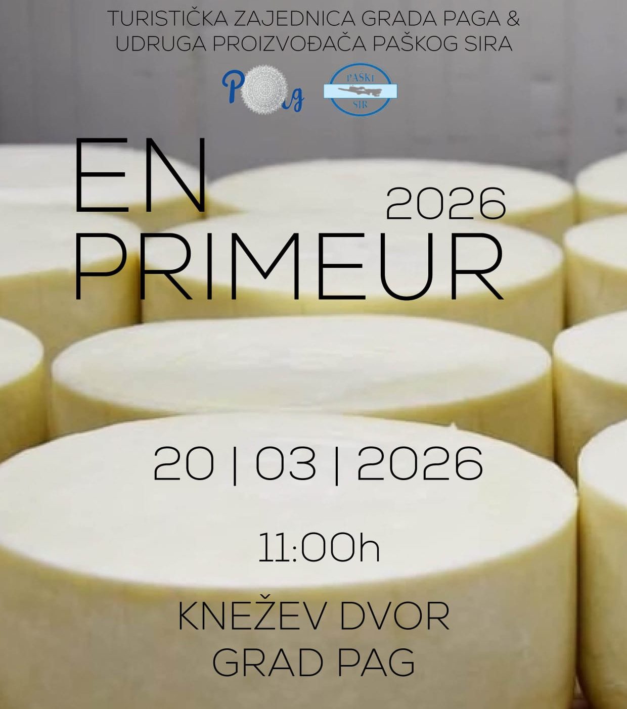 U organizaciji Udruge proizvođača paškog sira otoka Paga i Turističke zajednice Grada Paga u atriju Kneževog dvora u Pagu, u petak 20. ožujka u 11 sati, održat će se En Primeur 3.0 – premijera mladog paškog sira, sezona 2026.