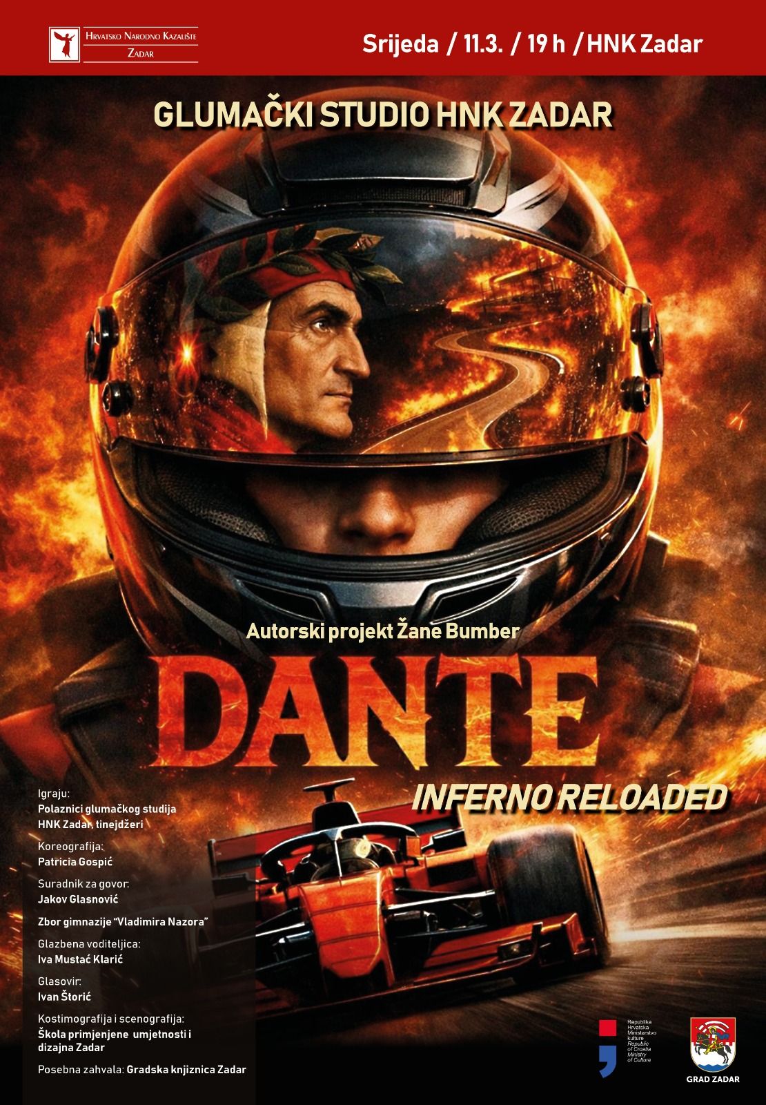 Hrvatsko narodno kazalište Zadar najavljuje u srijedu, 11. ožujka u 19 sati u HNK Zadar premijerno će biti izvedena predstava „Dante, Inferno reloaded“ u produkciji Glumačkog studija HNK Zadar.