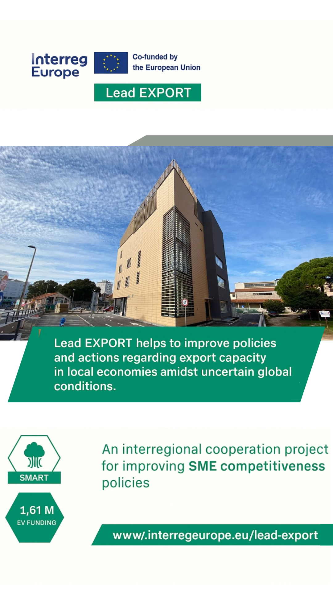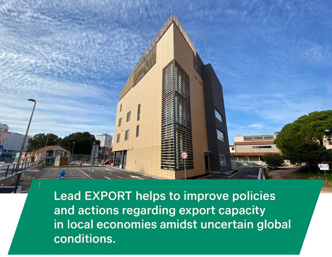 Projekt Lead EXPORT – „New approach to unleashing export capabilities in a local economy amidst uncertain conditions“ provodi se u okviru Programa Interreg Europe i traje od 1. svibnja 2025. do 31. srpnja 2029. godine. U njemu sudjeluju partneri iz devet europskih zemalja – Poljske, Mađarske, Danske, Grčke, Srbije, Ukrajine, Italije, Irske i Hrvatske. Kroz transnacionalne i bilateralne sastanke, radionice i analize razvijaju se nove politike i mehanizmi potpore izvozu. Lead EXPORT usmjeren je na jačanje konkurentnosti malih i srednjih poduzeća kroz razvoj izvoznog znanja i vještina, s ciljem povećanja njihove prisutnosti na inozemnim tržištima, poticanja rasta regionalnog gospodarstva te smanjenja osjetljivosti na gospodarske nesigurnosti, u skladu s prioritetima i kohezijskom politikom Europske unije. Poseban značaj projekt ima za Zadarsku županiju, koja sudjeluje kao pridruženi partner, jer se izravno nadovezuje na Plan razvoja Zadarske županije 2021.–2027. te pridonosi jačanju konkurentnosti i internacionalizaciji lokalnog gospodarstva.