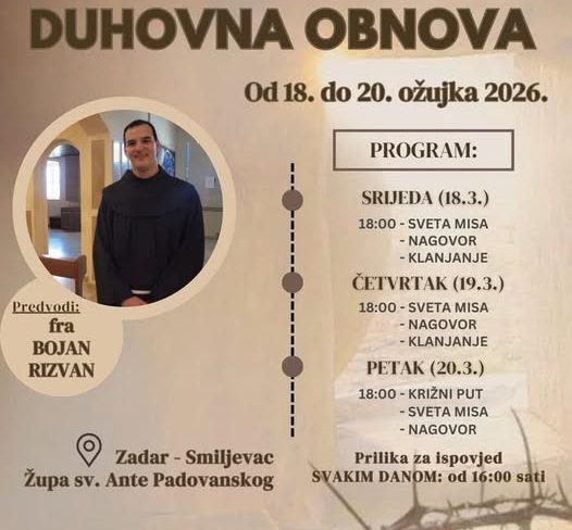 U župnoj crkvi sv. Ante Padovanskog na Smiljevcu u Zadru održat će se duhovna obnova od srijede, 18. ožujka, do petka, 20. ožujka, s početkom u 18 sati. Program predvodi fra Bojan Rizvan.