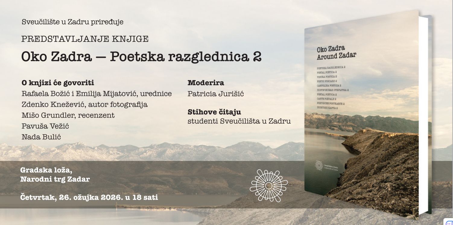 Sveučilište u Zadru priređuje predstavljanje knjige „Oko Zadra — Poetska razglednica 2“, koje će se održati u četvrtak 26. ožujka s početkom u 18 sati u Gradskoj loži (Narodni trg, Zadar).