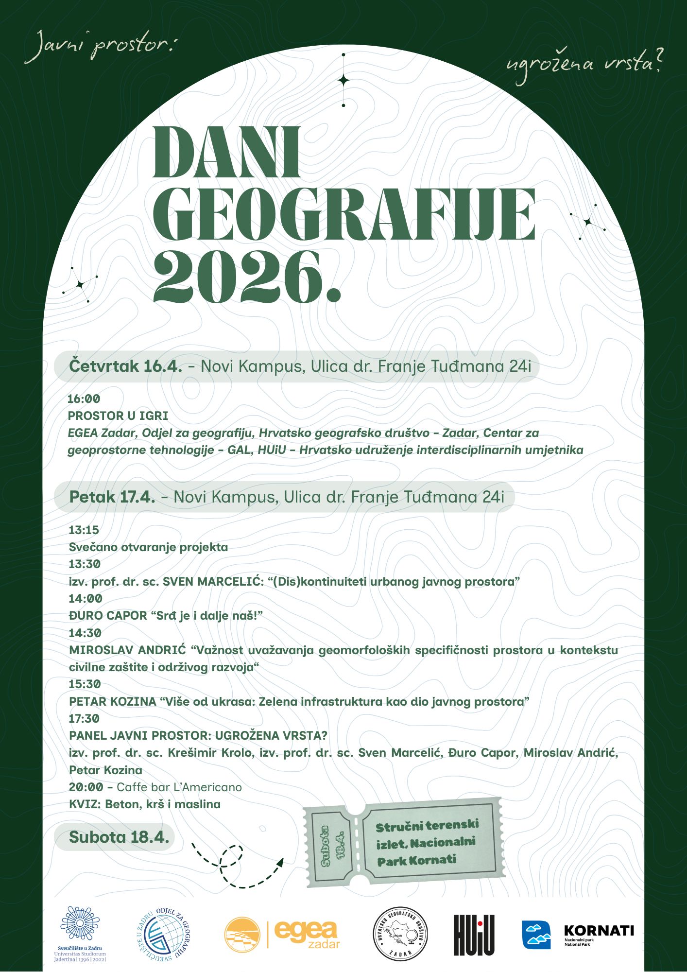 Na Sveučilištu u Zadru od 16. do 18. travnja 2026. godine održat će se manifestacija “Dani geografije 2026”, pod tematskim nazivom „Javni prostor: ugrožena vrsta?“. Riječ je o edukacijsko-kulturnom i znanstvenom projektu u organizaciji studenata, koji se provodi uz kontinuiranu podršku Odjel za geografiju Sveučilišta u Zadru i Hrvatsko geografsko društvo – Zadar.