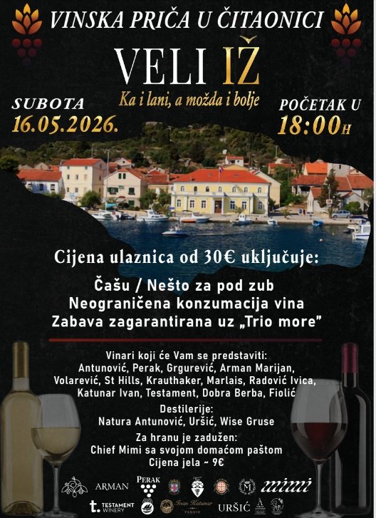 „Vinska priča u čitaonici“ održat će se 16. svibnja 2026. godine s početkom u 18 sati u Domu kulture na Velom Ižu.