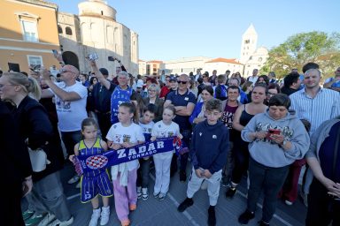 Na Narodnom trgu igrače su dočekali župan Zadarske županije Josip Bilaver, gradonačelnik Šime Erlić, brojni sportski djelatnici i uzvanici, kao i direktor KK Zadar Roko Jurlina, jedan od ključnih inicijatora obilježavanja ove velike obljetnice.