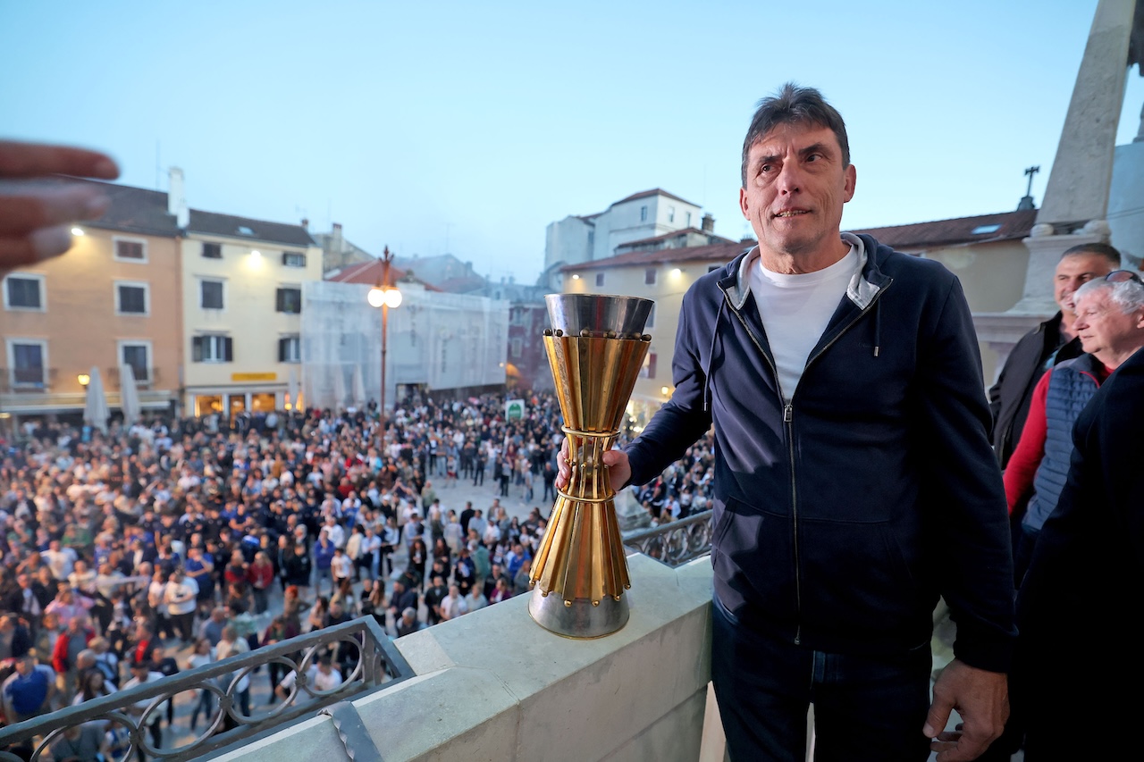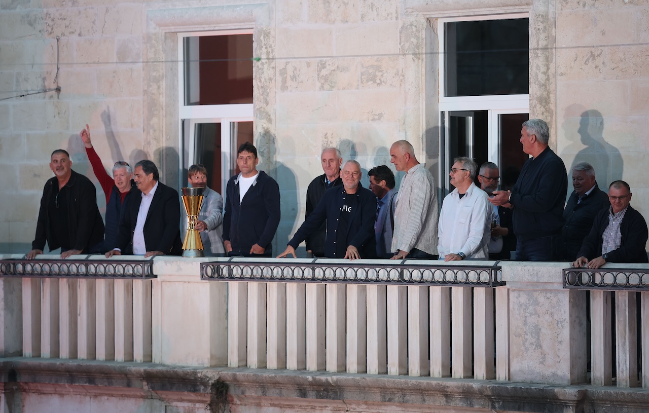 Vrhunac večeri dogodio se na balkonu gradske uprave, istom onom na kojem je prije 40 godina slavljen povijesni uspjeh. Gotovo cijela momčad popela se na balkon i podigla pehar, ponovivši trenutak koji je ušao u povijest. Posebno iznenađenje bilo je otkriće da je riječ o originalnom peharu, što ni sami igrači nisu znali do samog trenutka, budući da se u klupskim prostorijama čuva replika.